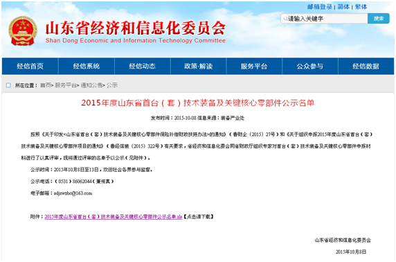 2015年度山東省首臺(tái)(套)技術(shù)裝備及關(guān)鍵核心零部件公示名單